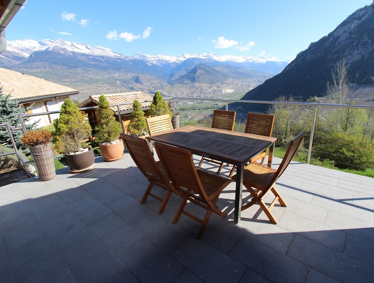 Magnifique villa de style moderne située à Vex, dans un quartier calme et verdoyant. Elle bénéficie d'un ensoleillement optimal et jouit d'une vue panoramique sur la ville de Sion, les alpes et les montagnes.